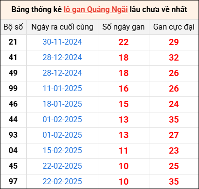 Bảng thống kê lô gan Quảng Ngãi lâu về nhất 10/5/2025