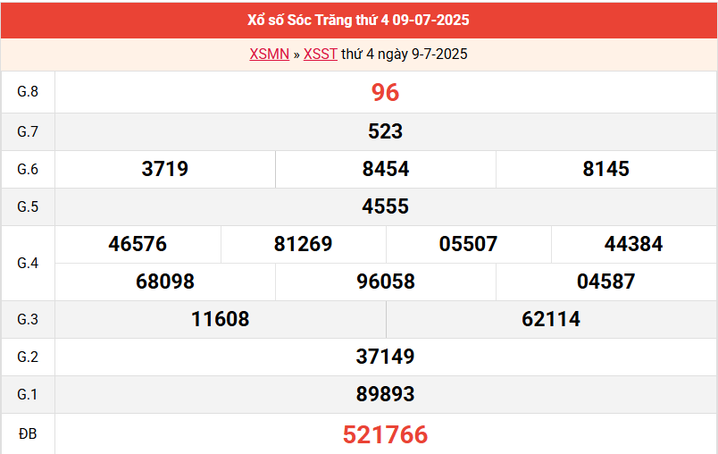 Bảng kết quả Sóc Trăng ngày 09/6/2025 tuần trước