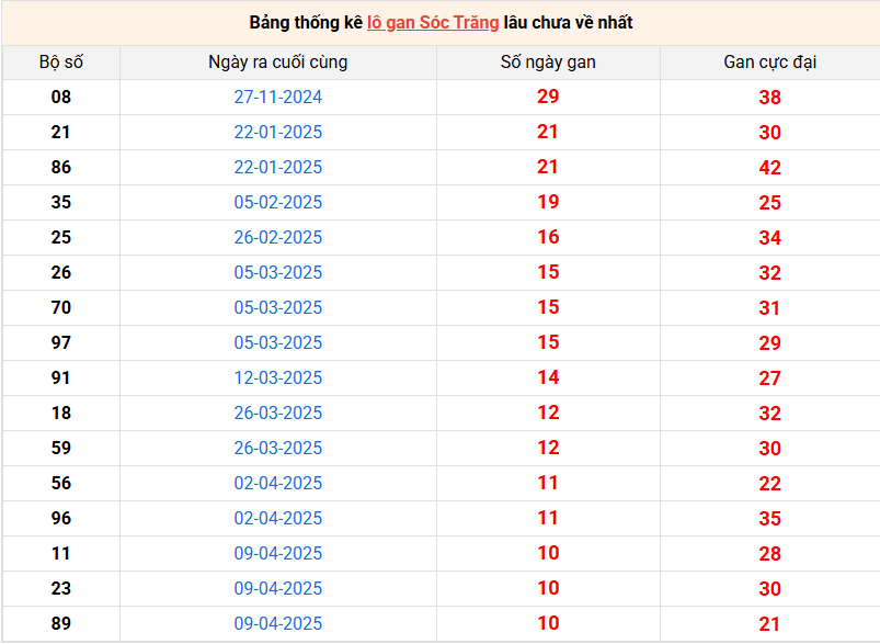 Bảng thống kê lô gan Sóc Trăng lâu về nhất 25/6/2025