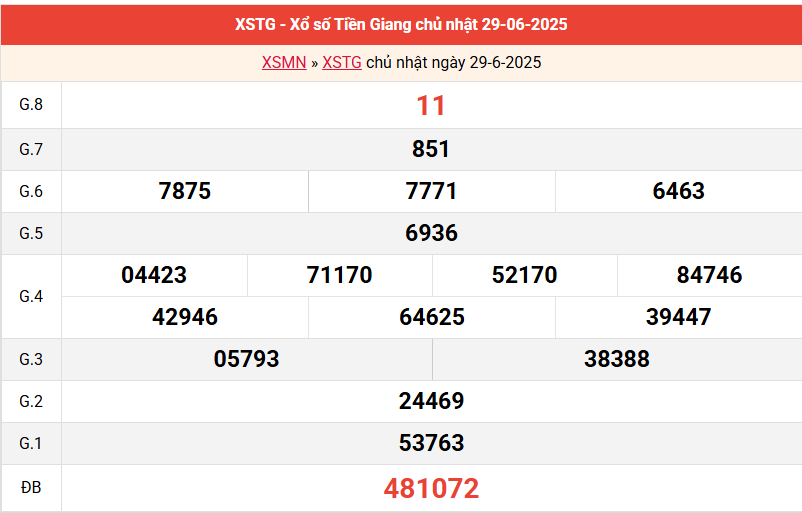 Bảng kết quả Tiền Giang ngày 29/6/2025 tuần trước