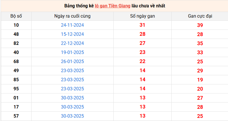 Bảng thống kê lô gan Tiền Giang lâu về nhất 06/7/2025