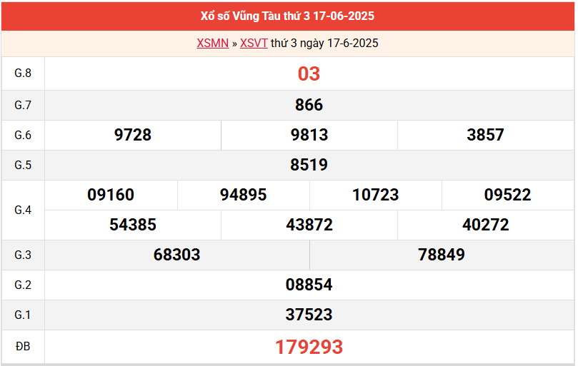 Bảng kết quả Vũng Tàu ngày 17/6/2025 tuần trước