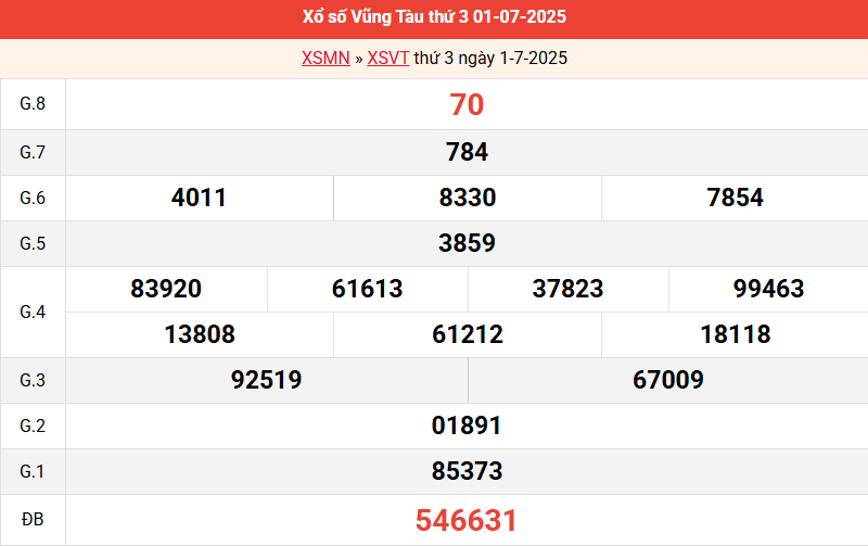Mời các bạn xem lại bảng kết quả kỳ trước với giải đặc biệt, giải tám, lô tô 2 số để có thể đưa ra nhận định chốt số dự đoán VT ngày 08 tháng 7 năm 2025 chuẩn xác nhất.