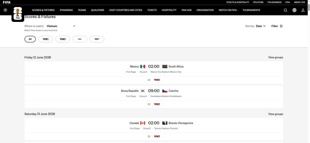 Website chính thức của FIFA mới đây đã công bố đầy đủ lịch thi đấu FIFA World Cup 2026, bao gồm thời gian, địa điểm, sân vận động và kênh phát sóng các trận theo từng quốc gia. Với người dùng tại Việt Nam, hệ thống hiển thị Đài Truyền hình Việt Nam (VTV) là đơn vị phát sóng, trong đó logo VTV3, VTV2, VTV5, VTV7, VTV10 xuất hiện ở nhiều trận. Tuy nhiên, đây có thể chưa phải lịch phát sóng cuối cùng.