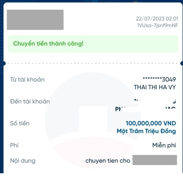 Một trong những lần chuyển khoản của Mây Bae cho anh N.