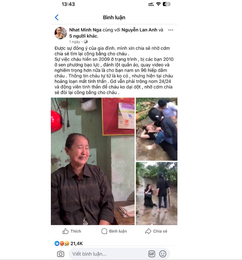 Cháu H., sinh năm 2009, trú tại phường Lê Lợi, TX Sơn Tây, Hà Nội bị HD bởi một người bạn mới quen. Qua tài liệu thu thập được, ban đầu đã xác định người có hành vi XHTD cháu H là N.V.D, sinh năm 1996, trú tại Chàng Sơn, Thạch Thất, Hà Nội. Cháu H bị nhóm bạn rủ đi chơi, đưa đến khu vực vắng người tại địa bàn xã Sen Phương, huyện Phúc Thọ sau đó dùng mũ bảo hiểm, chân tay tương tác rồi l** quần áo, quay video.