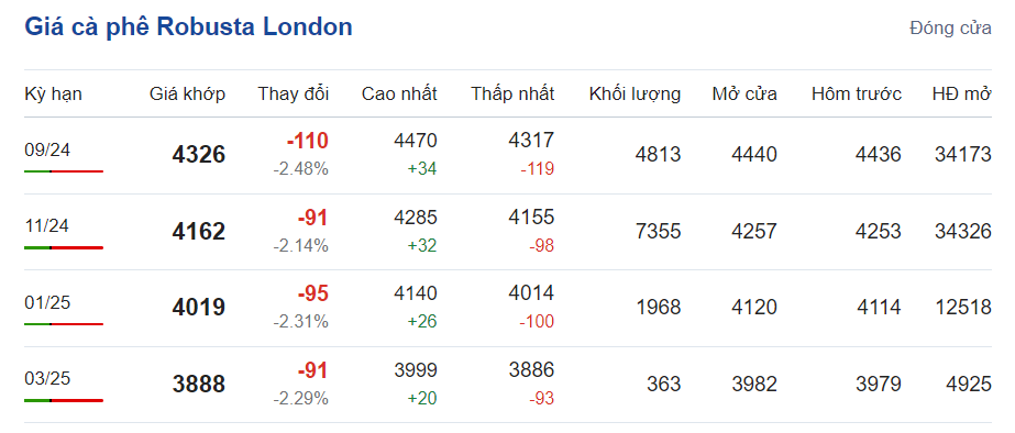 Kết thúc phiên giao dịch, giá cà phê Robusta trên sàn London lúc 5h00 phút ngày 13/7/2024 giảm mạnh, dao động từ 3.888 - 4.326 USD/tấn. Cụ thể, kỳ hạn giao hàng tháng 9/2024 là 4.326 USD/tấn (giảm 101 USD/tấn); kỳ hạn giao hàng tháng 12/2024 là 4.162 USD/tấn (giảm 91 USD/tấn); kỳ hạn giao hàng tháng 1/2025 là 4.019 USD/tấn (giảm 95 USD/tấn) và kỳ hạn giao hàng tháng 03/2025 là 3.888 USD/tấn (giảm 91 USD/tấn).