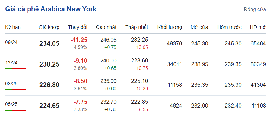 Giá cà phê Arabica trên sàn New York sáng ngày 11/8/2024 mức giảm mạnh từ 224.65 - 234.05 cent/lb. Cụ thể, kỳ hạn giao hàng tháng 9/2024 là 234.05 cent/lb (giảm 4.59%); kỳ giao hàng tháng 12/2024 là 230.25 cent/lb (giảm 3.80%); kỳ giao hàng tháng 3/2025 là 226.80 cent/lb (giảm 3.61%) và kỳ giao hàng tháng 5/2025 là 224.65 cent/lb (giảm 3.33%).