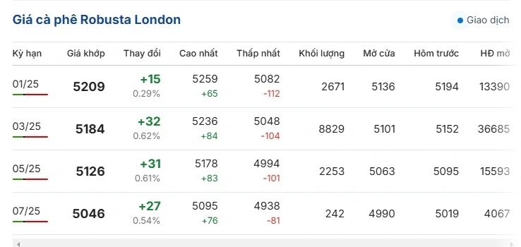Giá cà phê trên thị trường thế giới tối ngày 14/12 (theo giờ Việt Nam); so với phiên giao dịch gần nhất, giá cà phê Robusta London dao động ở mức 4.938 – 5.259 USD/tấn. Cụ thể, giá cà phê Robusta hợp đồng kỳ hạn giao tháng 1/2025 trên sàn London tăng 0,29%, tương đương 15 USD/tấn, giao dịch ở mức 5.209 USD/tấn.