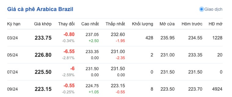 Giá cà phê Arabica Brazil sáng ngày 23/2/2024 cũng có hình thế giảm qua các kỳ hạn giao hàng. Cụ thể, kỳ hạn giao hàng tháng 3/2024 là 233,75 USD/tấn; kỳ giao hàng tháng 5/2024 là 226,80 USD/tấn; kỳ giao hàng tháng 7/2024 là 225,50 USD/tấn và giao hàng tháng 9/2024 là 223,15 USD/tấn.