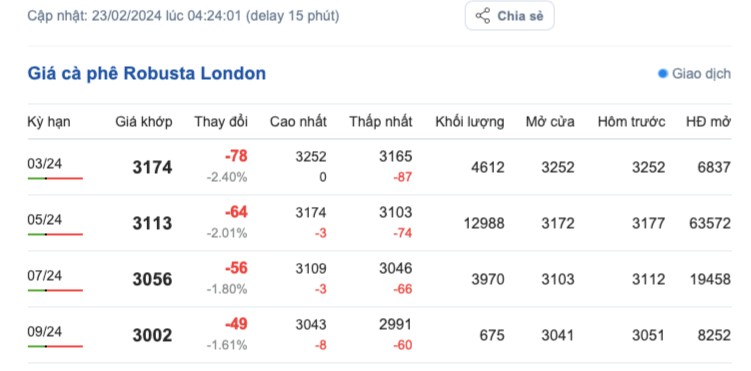 Kết thúc phiên giao dịch, giá cà phê Robusta trên sàn London lúc 4h24 phút ngày 23/2/2024 quay đầu giảm so với phiên giao dịch trước đó, mức giảm từ 49 - 78 USD/tấn, dao động từ 2.991 - 3.252 USD/tấn. Cụ thể, kỳ hạn giao hàng tháng 3/2024 là 3.174 USD/tấn; kỳ hạn giao hàng tháng 5/2024 là 3.113 USD/tấn; kỳ hạn giao hàng tháng 7/2024 là 3.056 USD/tấn và kỳ hạn giao hàng tháng 9/2024 là 3.002 USD/tấn.