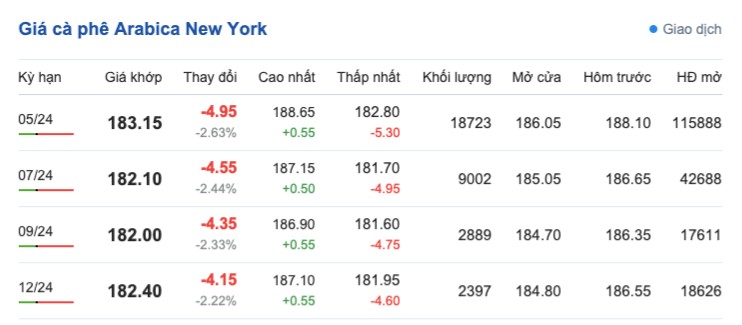 Cà phê Arabica trên sàn ICE Futures US (sàn New York) mở cửa lúc 16:15 và đóng cửa lúc 01:30 (hôm sau), giờ Việt Nam.