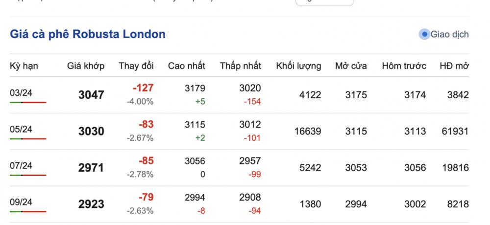 Kết thúc phiên giao dịch, giá cà phê Robusta trên sàn London lúc 4h50 phút ngày 26/2/2024 vẫn ở mức giảm, ít biến động so với phiên giao dịch trước đó, dao động từ 2.908 - 3.179 USD/tấn. Cụ thể, kỳ hạn giao hàng tháng 3/2024 là 3.047 USD/tấn; kỳ hạn giao hàng tháng 5/2024 là 3.030 USD/tấn; kỳ hạn giao hàng tháng 7/2024 là 2.971 USD/tấn và kỳ hạn giao hàng tháng 9/2024 là 2.923 USD/tấn