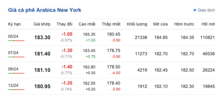 Tương tự, giá cà phê Arabica trên sàn New York sáng ngày 4/3/2024 vẫn giữ ổn định so với phiên giao dịch trước đó. Cụ thể, kỳ hạn giao hàng tháng 5/2024 là 183,30 cent/lb; kỳ giao hàng tháng 7/2024 là 181,40 cent/lb; kỳ giao hàng tháng 9/2024 là 181,10 cent/lb và kỳ giao hàng tháng 12/2024 là 180,95 cent/lb.