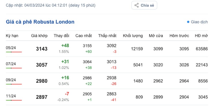 Kết thúc phiên giao dịch, giá cà phê Robusta trên sàn London lúc 4 giờ 12 phút ngày 4/3/2024 giữ mức ổn định so với phiên giao dịch trước, dao động từ 2.863 - 3.155 USD/tấn. Cụ thể, kỳ hạn giao hàng tháng 5/2024 là 3.143 USD/tấn; kỳ hạn giao hàng tháng 7/2024 là 3.057 USD/tấn; kỳ hạn giao hàng tháng 9/2024 là 2.980 USD/tấn và kỳ hạn giao hàng tháng 11/2024 là 2.897 USD/tấn.