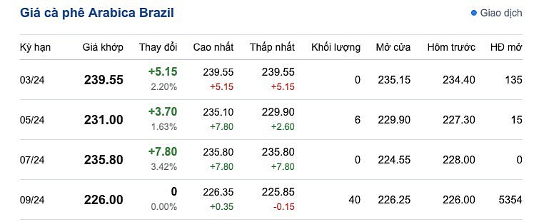 Bên cạnh đó, sắc xanh chiếm ưu thế với giá cà phê Arabica Brazil ngày 8/3/2024, xu hướng tăng được duy trì so với phiên giao dịch trước đó. Cụ thể, kỳ hạn giao hàng tháng 3/2024 là 239.55 USD/tấn; kỳ giao hàng tháng 5/2024 là 231,00 USD/tấn; kỳ giao hàng tháng 7/2024 là 235,80 USD/tấn và giao hàng tháng 9/2024 là 226,00 USD/tấn.