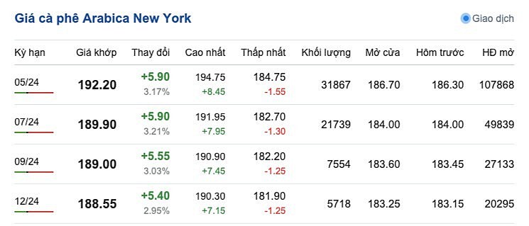Cụ thể, giá cà phê Arabica trên sàn New York ngày 8/3/2024 duy trì xu hướng tăng, mức tăng từ 2 - 3% so với phiên giao dịch trước. Kỳ hạn giao hàng tháng 5/2024 là 192,20 cent/lb; kỳ giao hàng tháng 7/2024 là 189,90 cent/lb; kỳ giao hàng tháng 9/2024 là 189,00 cent/lb và kỳ giao hàng tháng 12/2024 là 188,55 cent/lb.