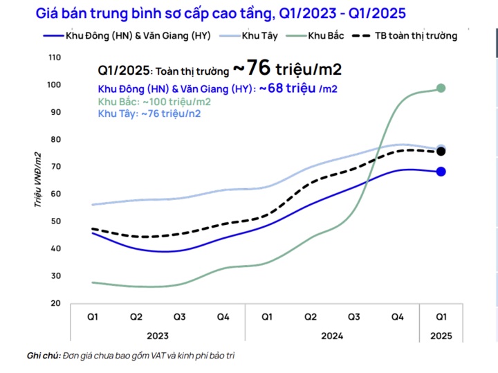 Đà tăng mạnh chỉ được "hãm phanh" lại khi bước sang quý I/2025. Báo cáo thị trường bất động sản quý I/2025 của CBRE cho thấy, tại thị trường sơ cấp, giá bán trung bình tại Hà Nội đạt xấp xỉ 75 triệu đồng/m². Mặc dù mức giá này cao hơn cùng kỳ năm 2024 là 34% song so với quý trước lại chỉ cao hơn 3%, là mức tăng giá theo quý thấp nhất kể từ quý II/2023.