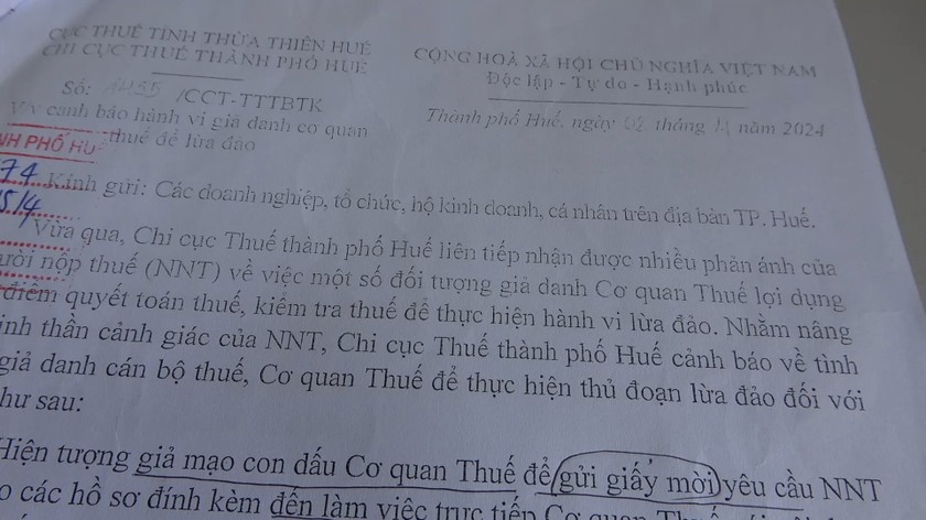 Ngành Thuế TP Huế và cơ quan công an đề nghị các doanh nghiệp, tổ chức, hộ kinh doanh, cá nhân trong thành phố hết sức nêu cao tinh thần cảnh giác, tránh bị lừa đảo chiếm đoạt tài sản.