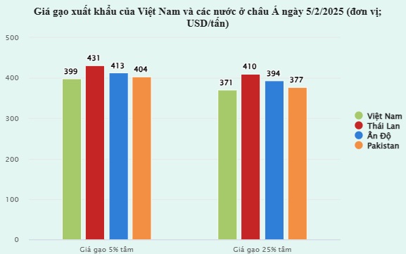 Cập nhật mới nhất từ Hiệp hội Lương thực Việt Nam (VFA), hôm 7/2, giá gạo tiêu chuẩn 5% tấm xuất khẩu của nước ta giảm còn 399 USD/tấn. Theo đó, gạo Việt đang có giá rẻ nhất châu Á khi thấp hơn hàng cùng loại của Thái Lan tới 32 USD/tấn, thấp hơn hàng Ấn Độ 14 USD/tấn và Pakistan 5 USD/tấn.