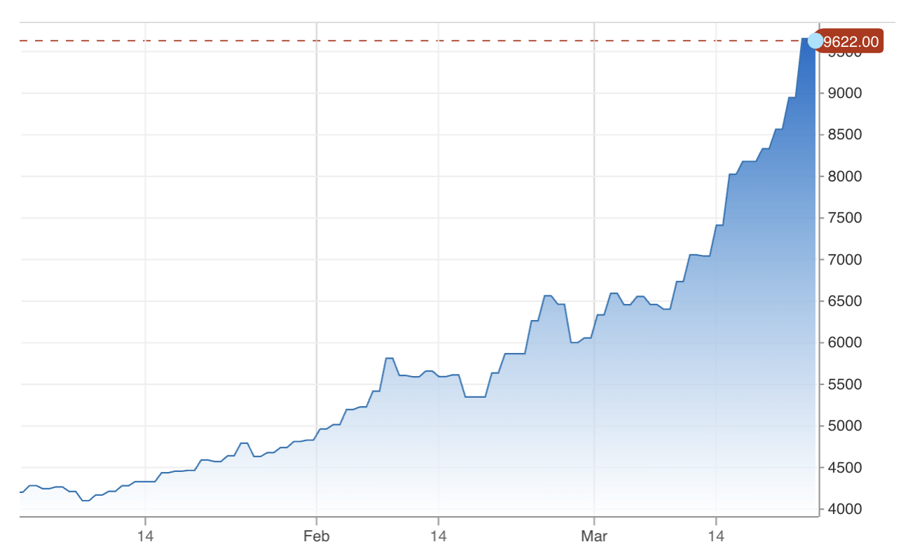 Diễn biến giá ca cao trong 1 năm qua. Đơn vị: USD/tấn - Nguồn: CNBC.