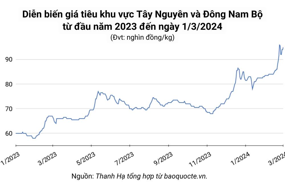 Thứ bảy ngày 24/2, giá tiêu đen giảm sau khi đạt đỉnh 98.000 đồng vào ngày 22/2/2024. Đến cuối tuần, giá lại tăng lên 94.000 đồng. Nhìn chung, giá tiêu đen tăng 8% so với tuần trước. Kể từ đầu năm 2024, giá tiêu đen cũng tăng 12,6%.