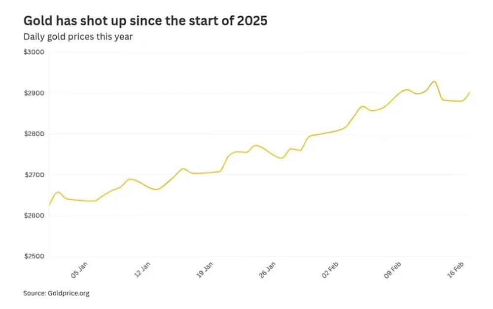 Chưa đầy 2 tháng đầu năm 2025, giá vàng đã tăng 10%, chạm mốc 2.900 USD/ounce. Dù vậy, UBS vừa tiếp tục nâng dự báo giá kim loại quý năm nay, theo City AM.