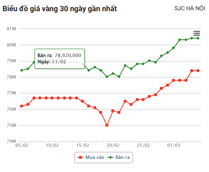 Vàng SJC tại Hà Nội niêm yết ở mốc 78,4 - 80,42 triệu đồng/lượng (mua vào - bán ra), tăng 600 nghìn đồng/lượng ở chiều mua và chỉ 100 nghìn đồng/lượng ở chiều bán.