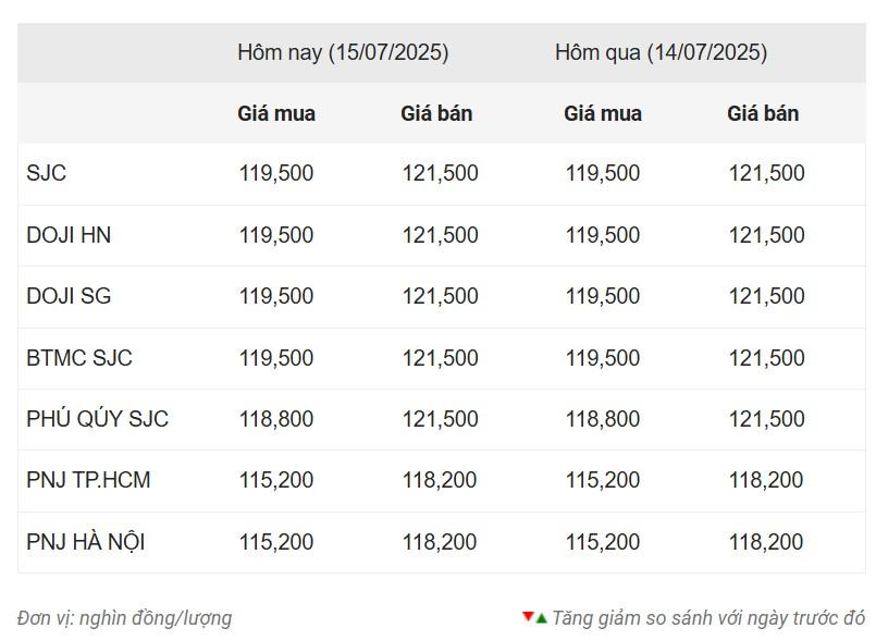 Tính đến 6h00 sáng 15/7, giá vàng miếng tại các thương hiệu lớn như SJC, DOJI, Bảo Tín Minh Châu (BTMC) đều giữ nguyên mức niêm yết so với phiên ngày hôm qua. Cụ thể, giá mua vào – bán ra tiếp tục duy trì quanh mức 119,5 – 121,5 triệu đồng/lượng. Thị trường vẫn đang giữ xu hướng tích lũy sau chuỗi tăng mạnh trước đó.