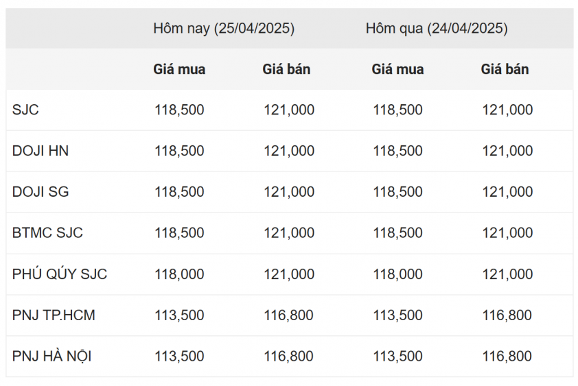 Tính đến 7h30 ngày hôm nay 25/4/2025, vàng miếng tại SJC, DOJI (Hà Nội và TPHCM) và Bảo Tín Minh Châu đều ghi nhận mức giá mua vào 118,5 triệu đồng/lượng và giá bán ra 121 triệu đồng/lượng. Mức chênh lệch mua vàng - bán ra ở đầu phiên là 2,5 triệu đồng/lượng.