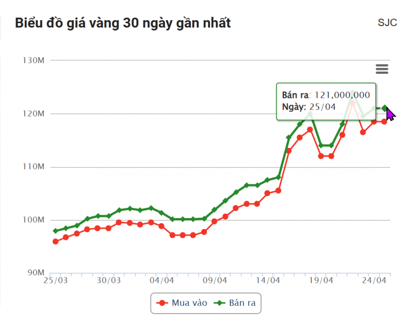 Biểu đồ giá vàng miếng SJC trong 30 ngày gần nhất