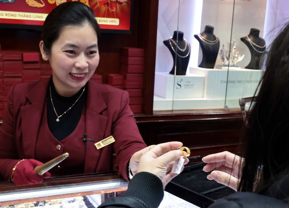 Mua bán vàng nhẫn tại cửa hàng Bảo Tín Minh Châu. Ảnh: Trần Việt - TTXVN