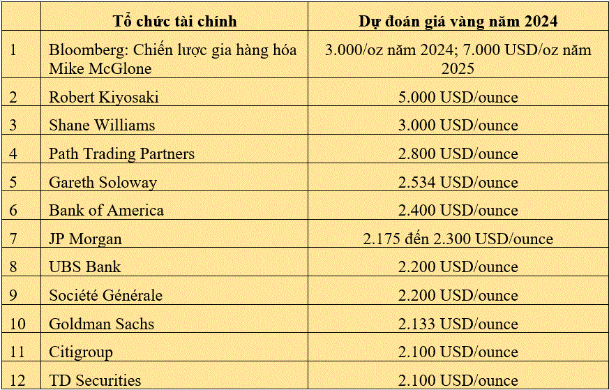 - Các chuyên gia dự báo rằng vàng vẫn còn nhiều dư địa để tăng giá do Cục Dự trữ Liên bang Mỹ (Fed) có khả năng sẽ bắt đầu nới lỏng chính sách tiền tệ trong thời gian tới.