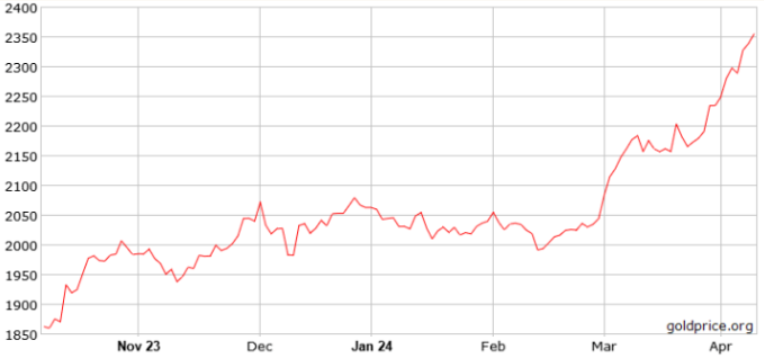 Giá tăng mạnh từ giữa tháng 2 và trong hai tháng mỗi ounce đã đắt thêm 350 USD. Giới phân tích cho rằng đợt tăng lần này có nhiều nguyên nhân. Đó là bất ổn địa chính trị, lực mua của các ngân hàng trung ương và kỳ vọng Cục Dự trữ liên bang Mỹ (Fed) giảm lãi suất năm nay.