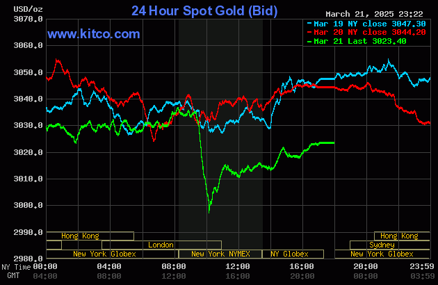 Chốt phiên giao dịch ngày 21/3, giá vàng thế giới giao ngay giảm xuống còn 3.023 USD/ounce. Trong phiên, có thời điểm kim loại quý rơi về 2.996 USD - mức thấp nhất trong một tuần. Hợp đồng tương lai vàng Mỹ cũng mất 0,7%, còn 3.021 USD.