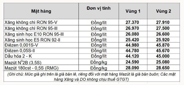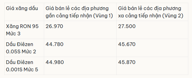 Ở nhóm dầu, dầu diesel 0.05S tăng mạnh 3.961 đồng/lít, lên mức không quá 44.788 đồng/lít. Dầu mazut 180CST 3.5S cũng tăng 1.262 đồng/kg, với giá bán tối đa không vượt quá 24.593 đồng/kg.