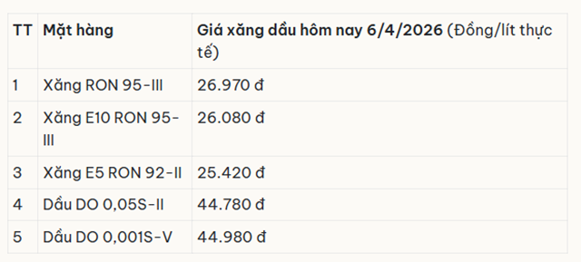 Giá xăng dầu hôm nay 6/4/2026 lúc 4h15 sáng. Bảng giá xăng dầu hôm nay 6/4/2026 từ Petrolimex, PVOIL, Mipecorp, Thalexim ...