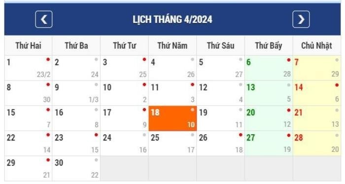 Theo lịch, năm nay (2024), ngày 10 tháng 3 Âm lịch rơi vào thứ 5 ngày 18/4/2024. Như vậy, theo quy định của luật, dịp Giỗ Tổ Hùng Vương được nghỉ 1 ngày và vẫn được trả lương theo quy định. Trường hợp đi làm vào ngày này, người lao động được trả mức 300% so với lương ngày thường.