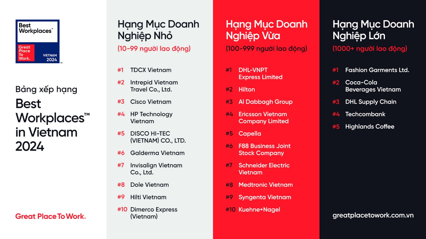 Ngày 23/5, Great Place to Work® - cơ quan toàn cầu về văn hóa nơi làm việc - đã công bố 25 công ty nằm trong Bảng xếp hạng Best Workplaces™ in Vietnam 2024 (Nơi làm việc Xuất sắc Hàng đầu Việt Nam 2024).