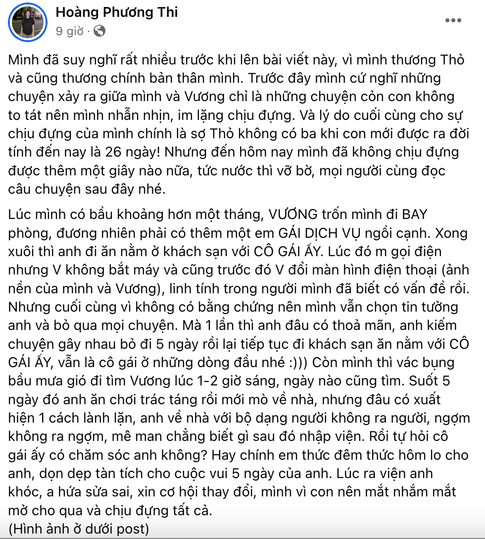 Hoàng Phương Thi bức xúc viết trên trang cá nhân: "Mình đã suy nghĩ rất nhiều trước khi lên bài viết này, vì mình thương Thỏ và cũng thương chính bản thân mình. Trước đây mình cứ nghĩ những chuyện xảy ra giữa mình và Vương chỉ là những chuyện cỏn con không to tát nên mình nhẫn nhịn, im lặng chịu đựng. Và lý do cuối cùng cho sự chịu đựng của mình chính là sợ Thỏ không có ba khi con mới được ra đời tính đến nay là 26 ngày! Nhưng đến hôm nay mình đã không chịu đựng được thêm một giây nào nữa, tức nước thì vỡ bờ.
