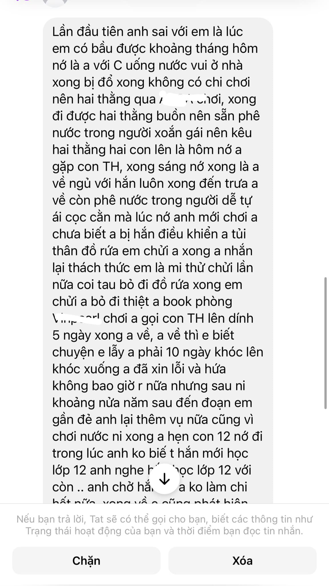 Lúc mình có bầu khoảng hơn một tháng, Vương trốn mình đi bay phòng, đương nhiên phải có thêm một em gái dịch vụ ngồi cạnh. Xong xuôi thì anh đi ăn nằm ở khách sạn với cô gái đấy. Lúc đó mình gọi điện nhưng Vương không bắt máy và cũng trước đó Vương đổi màn hình điện thoại (ảnh nền của mình và Vương), linh tính trong người mình đã biết có vấn đề rồi. Nhưng cuối cùng vì không có bằng chứng nên mình vẫn chọn tin tưởng anh và bỏ qua mọi chuyện. Mà 1 lần thì anh đâu có thoả mãn, anh kiếm chuyện gây nhau bỏ đi 5 ngày rồi lại tiếp tục đi khách sạn ăn nằm với cô gái ấy, vẫn là cô gái ở những dòng đầu nhé. Còn mình thì vác bụng bầu mưa gió đi tìm Vương lúc 1-2 giờ sáng, ngày nào cũng tìm.