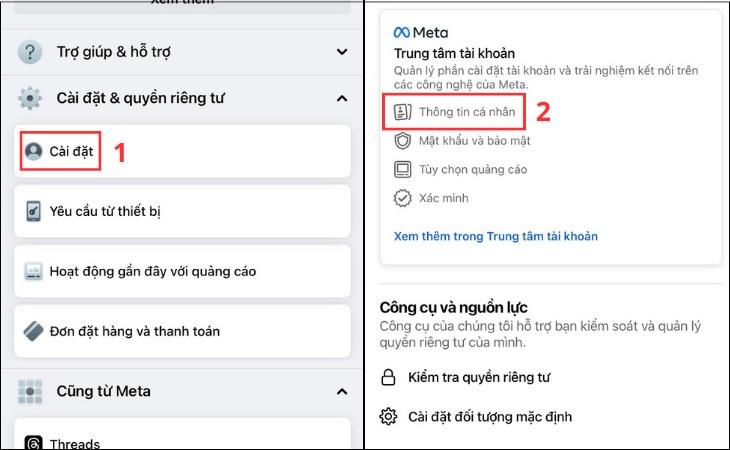 ✅Bước 2: Tại mục Cài đặt & quyền riêng tư, hãy chọn phần Cài đặt. Kế đến, bạn hãy lần lượt nhấn Trung tâm tài khoản Meta và Thông tin cá nhân trong Trung tâm tài khoản.