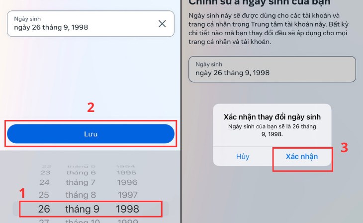 ✅Bước 5: Hãy điều chỉnh ngày sinh theo nhu cầu và nhấn Lưu. Cuối cùng, bạn cần bấm Xác nhận để Facebook cập nhật dữ liệu.