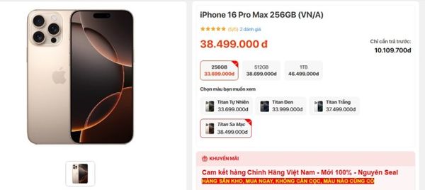 Tại một đại lý ủy quyền của Apple, iPhone 16 Pro Max màu mới được bán với giá lần lượt 38, 44 và 50 triệu đồng cho các lựa chọn dung lượng bộ nhớ 256, 512 GB và 1 TB. Mức này cao hơn 3 triệu đồng so với giá niêm yết ban đầu. Phiên bản màu trắng cũng được bán chênh một triệu, trong khi màu đen và titan tự nhiên vẫn giữ nguyên mức khởi điểm 35 triệu đồng.