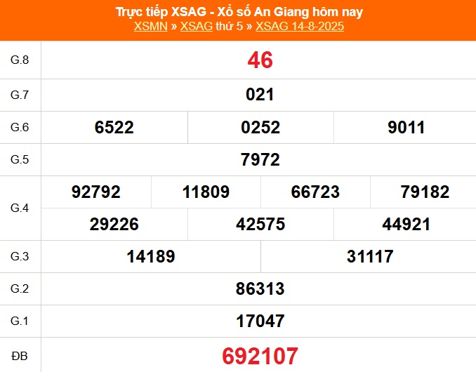 XSAG 14/8, kết quả xổ số An Giang hôm nay ngày 14/8/2025.