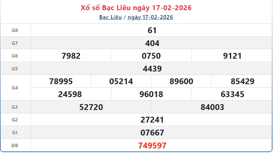 XSBL 17/2. XSBL Thứ Ba. Trực tiếp KQXSBL ngày 17/2. Kết quả xổ số Bạc Liêu hôm nay ngày 17/2/2026. Kết quả xổ số Bạc Liêu Thứ Ba ngày 17/2/2026.