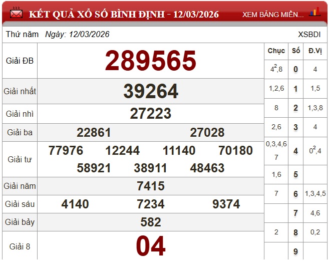 Kết quả xổ số Bình Định Thứ Năm ngày 12/3/2026