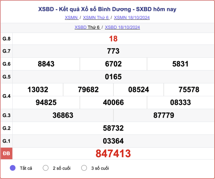 XSBD 18/10, kết quả xổ số Bình Dương hôm nay 18/10/2024.