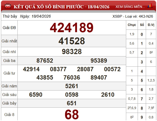 Kết quả xổ số Bình Phước ngày 18/4/2026