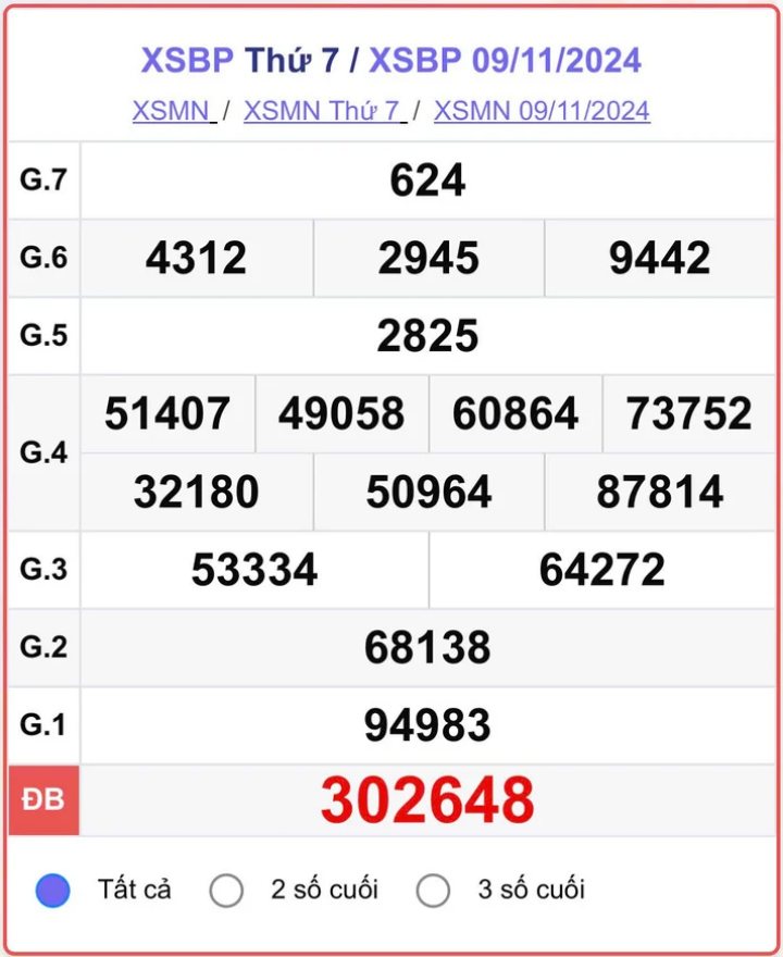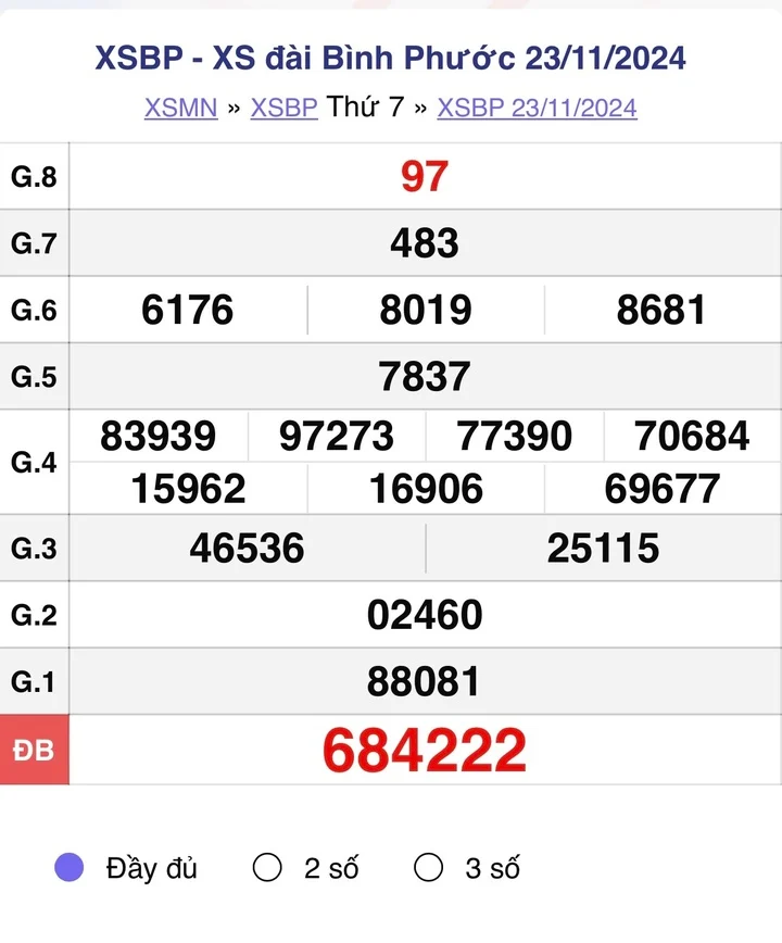 XSBP 30/11. Kết quả xổ số Bình Phước hôm nay thứ Bảy ngày 30/11/2024 sẽ được cập nhật nhanh chóng và chính xác nhất trên LDG. Kết quả các giải thưởng XSBP ngày 30/11/2024 được công bố lần lượt từ giải nhất cho đến giải tám, cuối cùng là giải đặc biệt.